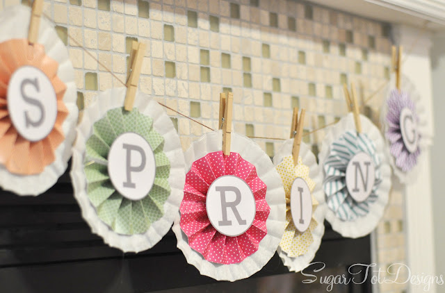 After you have your pinwheels made, simply glue them onto 2 coffee filters, hang your twine and pin up your banner with the clothes pins. Then sit back and enjoy this WONDERFUL Spring season!